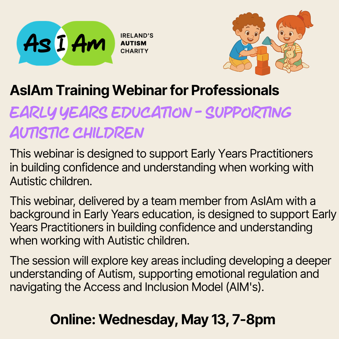 It will also focus on practical ways to support Autistic children’s needs through the Aistear curriculum, ensuring inclusive and meaningful participation in early learning environments.
